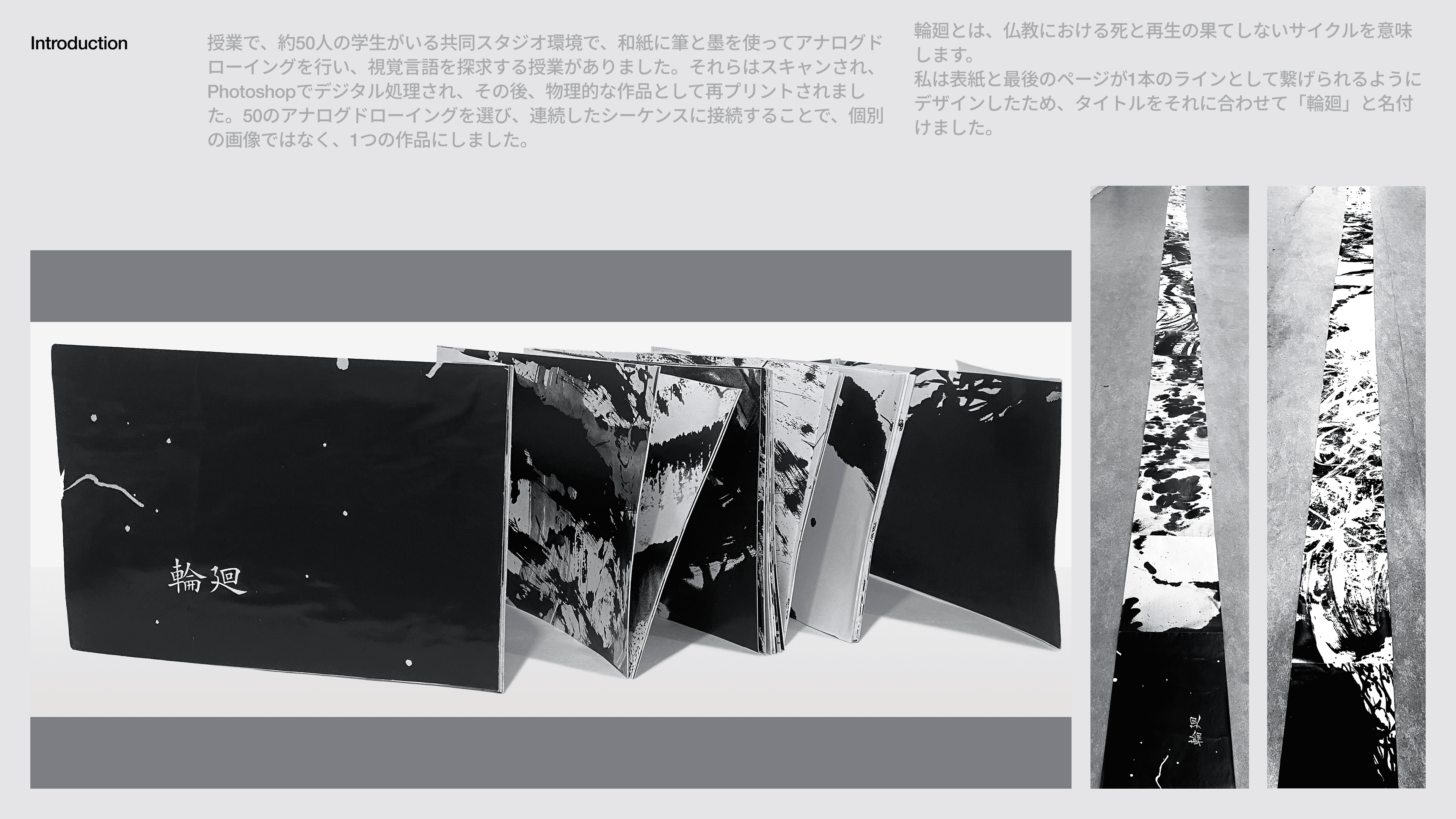 授業で、約50人の学生がいる共同スタジオ環境で、和紙に筆と墨を使ってアナログドローイングを行い、視覚言語を探求する授業がありました。それらはスキャンされ、Photoshopでデジタル処理され、その後、物理的な作品として再プリントされました。50のアナログドローイングを選び、連続したシーケンスに接続することで、個別の画像ではなく、1つの作品にしました。